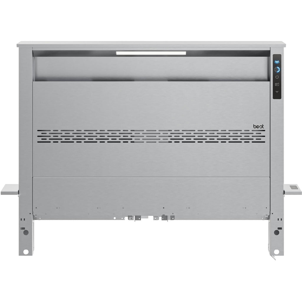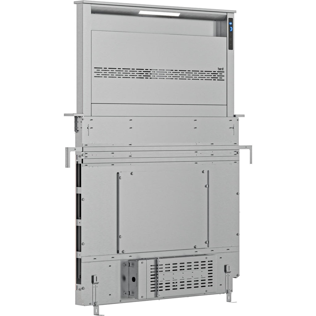 An optional remote control button raises or lowers the downdraft as needed.