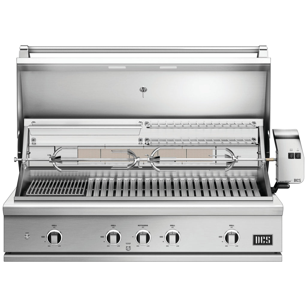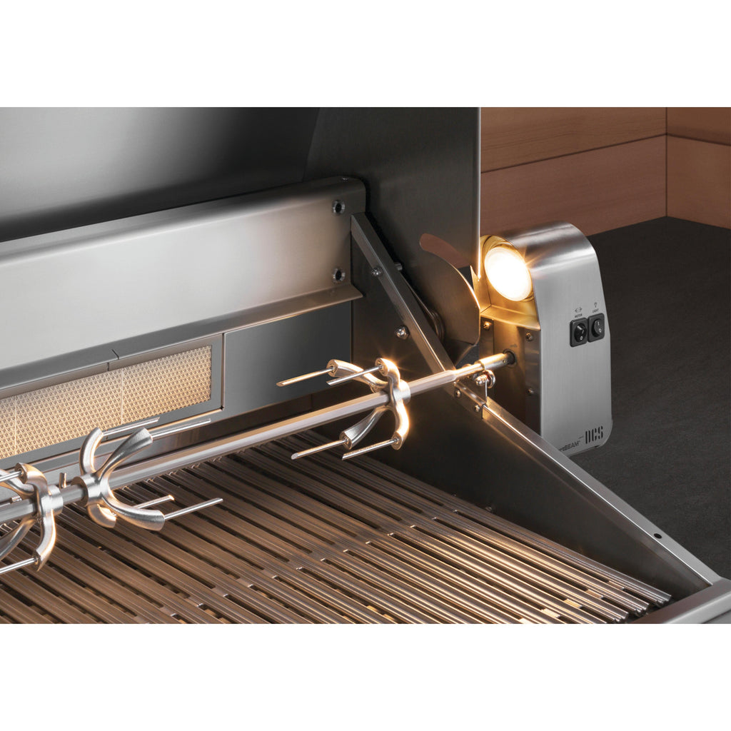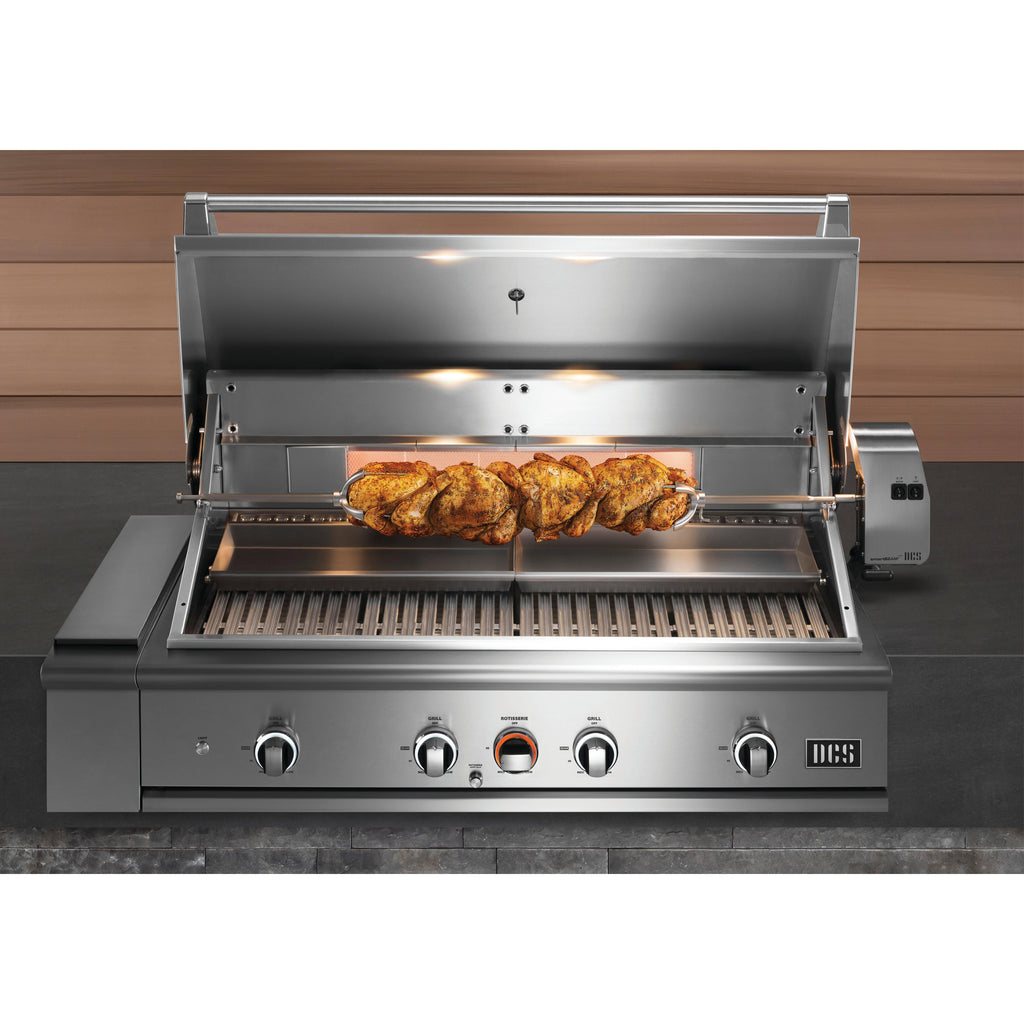 An infrared rotisserie burner provides controlled searing. The heavy-duty motor easily turns a 50lb load, ideal when cooking for a big crowd. The rotisserie rod is conveniently stored under the drip pan handle.