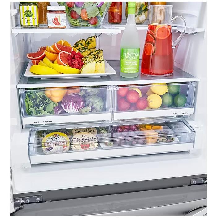 Stock-up and store everything you need. With a cavernous 24 cubic feet of space, this LG French Door refrigerator gives you ample space for all of your family's favorite foods and keeps them conveniently organized and within reach.