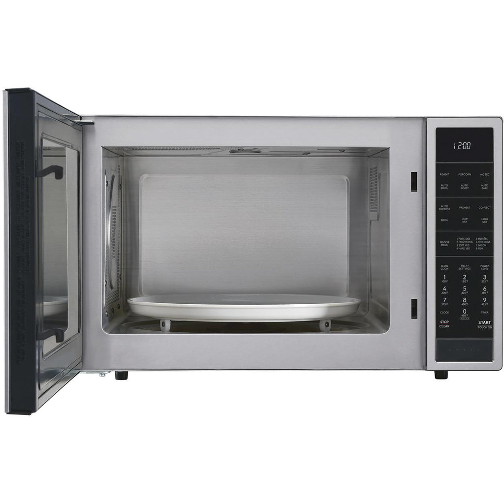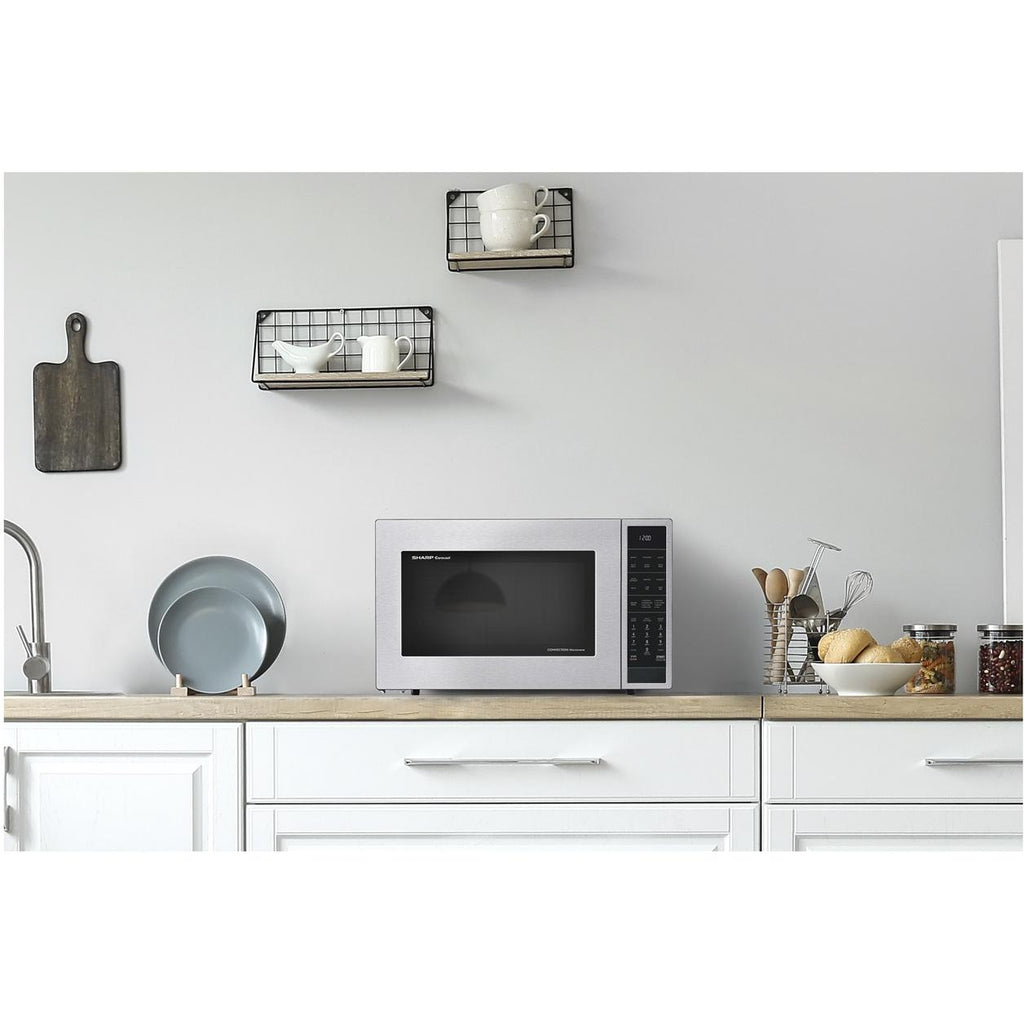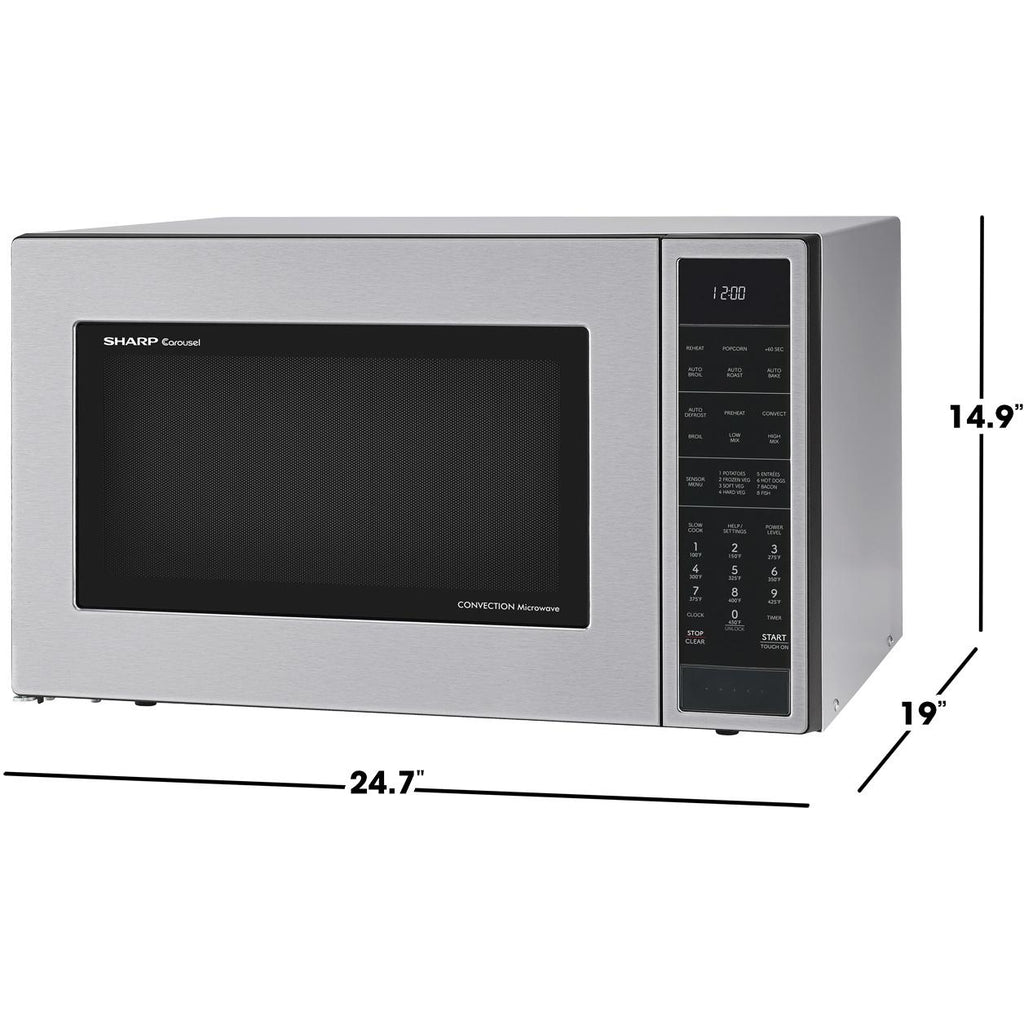 The SMC1585KS, Family-Size, 1.5 cu. ft., 900 Watt Microwave Oven with Convection in Stainless Steel gives you the best of both worlds. Convection technology circulates the heated air and gives you perfect roasting, baking and browning. Easy-to-clean stainless steel interior, plus bright LED lighting complement your style. The 14.1 in., dishwasher-safe ceramic plate of the Carousel® turntable system makes cleanup easy. The white LED display is bright and easy-to-read.